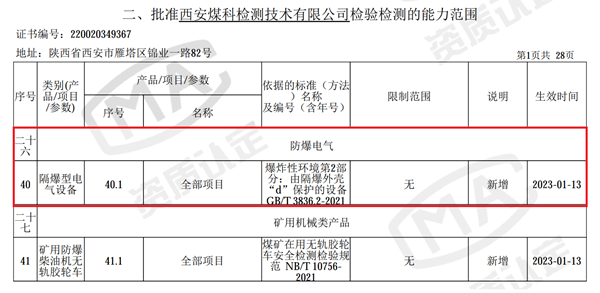 近日,西安研究院煤科检测技术有限公司顺利通过国家认证认可监督管理委员会CMA“隔爆型电气设备”扩项申请,这标志着检测公司已经具备开展“隔爆型电气设备”的计量认证检测检验资质。